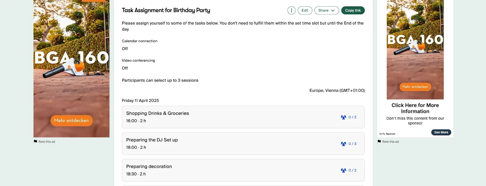 He used Doodle’s sign-up sheet tool in a creative way by setting it up as a to-do list. He defined short time slots as tasks, limited participant entries to avoid overbooking, and created a participant list via a group survey titled “Steve’s Birthday Party.”